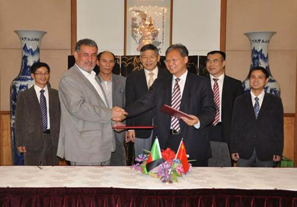 徐飞洪大使(右三)与阿方能源水利部水务司长穆罕穆迪(左二)互换移交证书